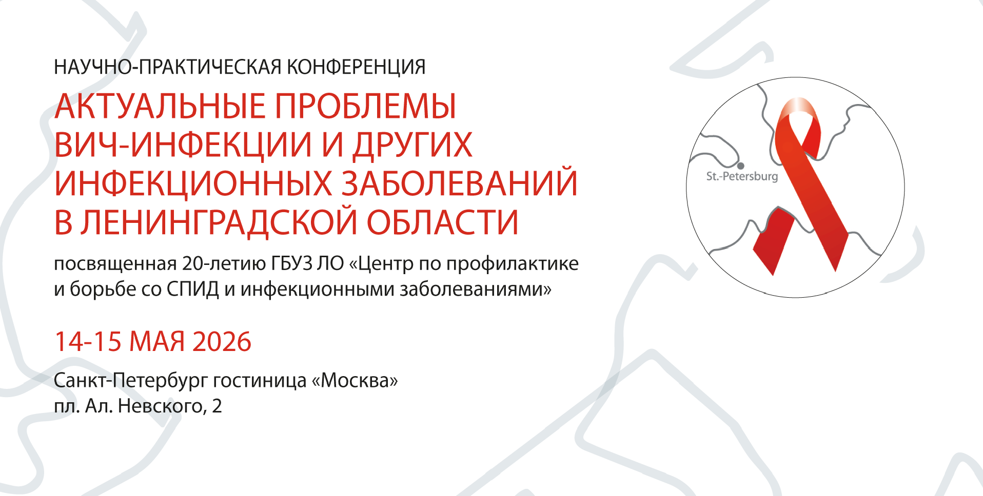 14-15 мая 2026 года в Санкт-Петербурге состоится Научно-практическая конференция «Актуальные проблемы ВИЧ-инфекции и других инфекционных заболеваний в Ленинградской области», посвященная 20-летию ГБУЗ ЛО «Центр по профилактике и борьбе со СПИД и инфекционными заболеваниями». Мероприятие будет проведено в очном формате в гостинице «Москва» по адресу: пл. Александра Невского, 2 (ст.м. «пл. Александра Невского 1»).