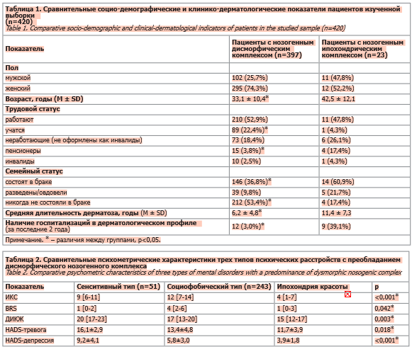 Conclusion. The identified subtypes of comorbid mental disorders–characterized by the predominance of the dysmorphic nozogenic complex (sensitive, social-phobic, and “beauty hypochondria” types)–exhibit well-defined clinical profiles. This proposed typology demonstrates high differential-diagnostic and prognostic utility, providing a scientifically grounded framework for personalized, integrated management of psychodermatological patients in accordance with contemporary psychosomatic medicine principles.
