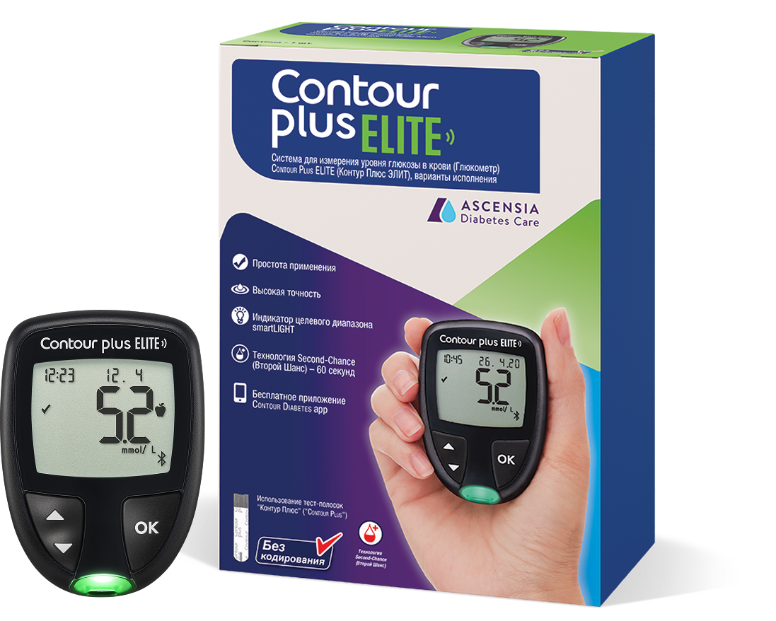 Система Контур Плюс Элит продемонстрировала погрешность в общем диапазоне ±0,47 ммоль/л или ±8,4%**,1.
